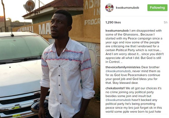 “I am disappointed with some of the Ghanaians. Because I started with my Peace campaign since a year ago and now some of the people are criticizing me that I endorsed for a certain Political Party which is not true… And I am worry about it… since you didn’t appreciate all what I did. But God is still in Control. ..”