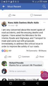 Prez Akuffo Addo in a Facebook post on Friday wrote ” I am very concerned about the recent spate of road accidents, and the ensuring death and injuries. I have asked the ministers for interior, roads and highways and transport to meet and come out with proposals immediately to address this critical issue in order to improve the safety of our roads.