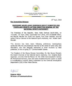 The statement further reveals that President of the Ghana Olympic Committee, Ben Nunoo Mensah and some other officials who were with Ghana’s team at the 2018 Commonwealth Games “have been recalled from the Games to assist in investigations currently being undertaken by the Criminal Investigation Department of the Police Service”.