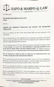 “We are instructed to notify you that our client takes a serious view of your defamatory publication on Facebook and would not hesitate to commence legal action against you if the said publication is not retracted on or before June 1, 2018.