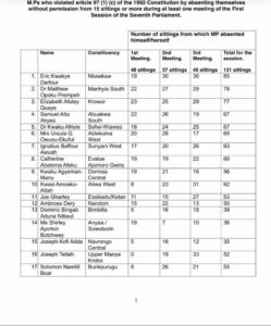 According to him, Article 97 (1) of the 1992 constitution stipulates that, “A member of Parliament shall vacate his seat in Parliament; (c) if he is absent, without permission in writing of the Speaker and he is unable to offer a reasonable explanation to the Parliamentary Committee on Privileges from fifteen sittings of a meeting of Parliament during any period that Parliament has been summoned to meet and continues to meet”.
