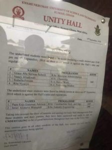 The notice which served as a warning to other residents of the Hall stated that “taking into account the show of remorse and apology to Unity Hall Management from these students and their parents, they have been cautioned and made to sign an undertaking to be of good behaviour throughout their stay in the Unity Hall”.