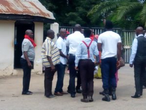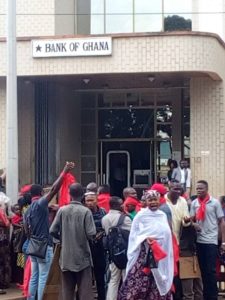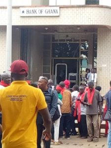 Wearing red arm bands and looking unhappy with the response by the BoG branch in Kumasi, they proceeded to the Regional Coordinating Council to petition the Regional Minister, Simon Osei-Mensah.