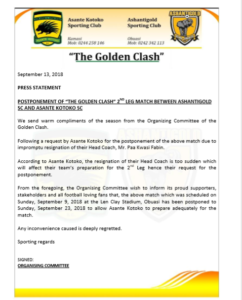 The 2nd leg of “The Golden Clash” between Kotoko and Ashantigoldhas been called off upon the request of Kotoko after their head coach Paa Kwesi Fabin resigned.