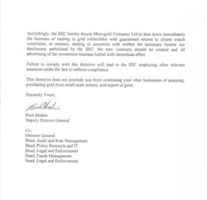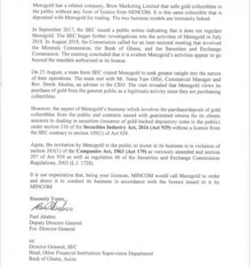 In the 3 September 2018 letter signed by Deputy Director General, Paul Ababio, the SEC said: “In September 2017, the SEC issued a public notice indicating that it does not regulate Menzgold. The SEC began further investigations into the activities of Menzgold in July 2018.