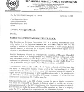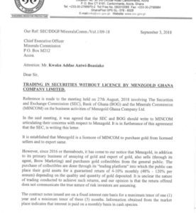 In the 3 September 2018 letter signed by Deputy Director General, Paul Ababio, the SEC said: “In September 2017, the SEC issued a public notice indicating that it does not regulate Menzgold. The SEC began further investigations into the activities of Menzgold in July 2018.