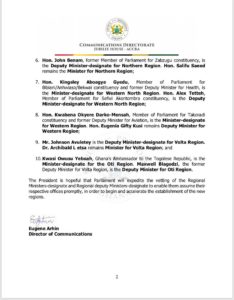 The release further named Minister for former Brong Ahafo Region, Evans Opoku Bobie, also MP for Asunafo North constituency as to head the Ahafo Region while Tano South MP, Benjamin Yeboah Sekyere, is the Deputy Minister-designate.