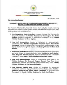 The release further named Minister for former Brong Ahafo Region, Evans Opoku Bobie, also MP for Asunafo North constituency as to head the Ahafo Region while Tano South MP, Benjamin Yeboah Sekyere, is the Deputy Minister-designate.