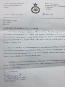 A letter to the management of XYZ media stated that “there is report of threat of death on the life of Joy FM Journalist. Mr Mannesseh Azure Awuni. This threat happened in the wake of the airing of the documentary titled ‘MILITIA IN THE HEART OF THE NATION’ on -DE EYE GROUP’ or Joy TV on 7th March 2019.”