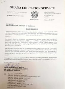 “Management of the Ghana Education Service wishes to inform staff with salary concerns, especially on promotions and upgrades, and newly recruited teachers that the staff is working relentlessly to complete all data inputs to enable salary arrears to be paid.”