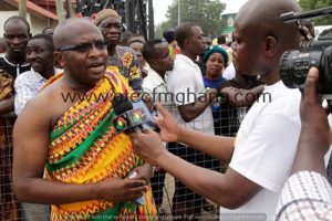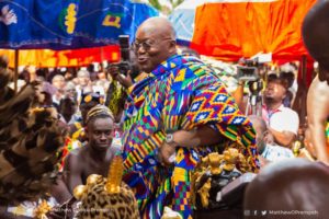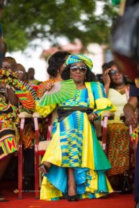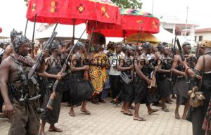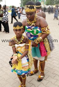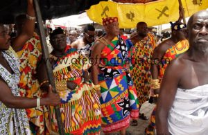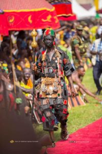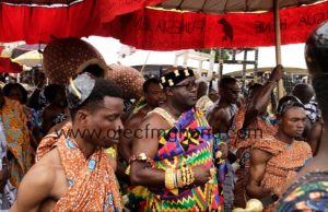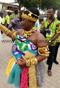 The Asantehene, Otumfuo Osei Tutu II, entered the palace in a palanquin, dressed in a ‘kente’ cloth, with gold ornaments around his wrists and arms, amidst drumming and firing of muskets.