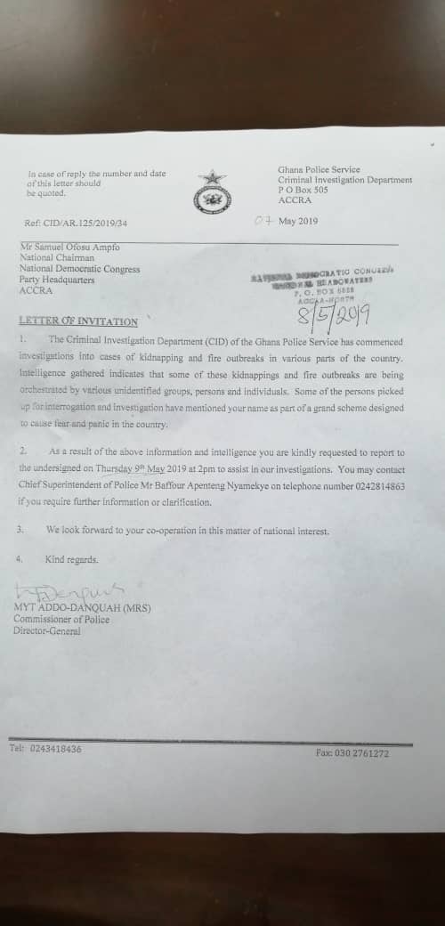 A letter of invitation written and signed by the CID boss to Mr Ampofo on May 7, 2019, among other things, said her outfit was inviting Mr Ampofo as part of investigations into the kidnappings and fire outbreaks.