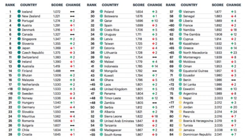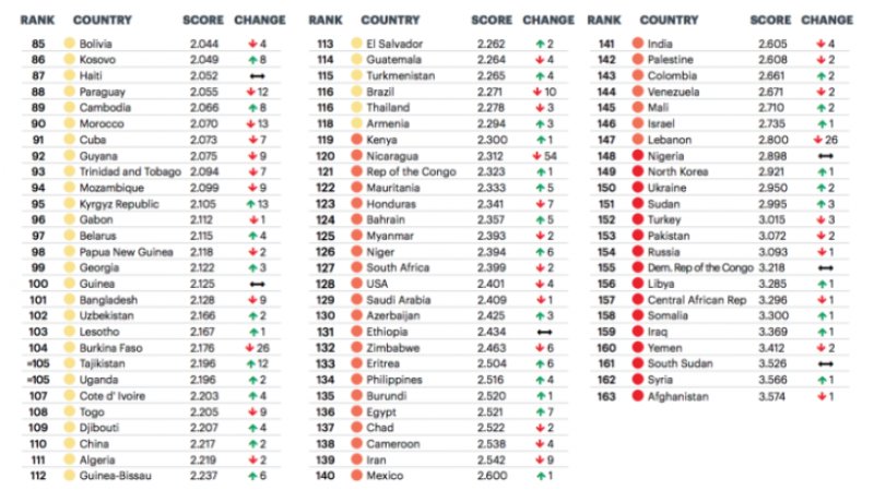 The index from the Institute for Economics & Peace also reveals that for the first time in five years, there is a slight improvement in global peacefulness. On average, country scores improved 0.09 percent, as 86 countries recorded more peacefulness and 76 countries showed deterioration.