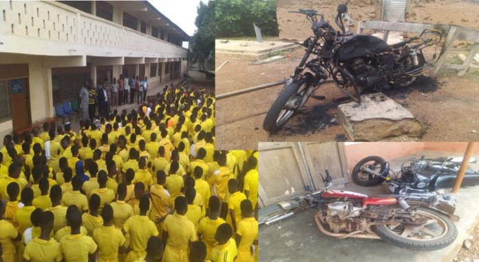 A clash erupted among students on the campus around midnight on Tuesday after some students refused to comply with an order to go to bed by the school’s cadet corps. Vehicles and houses were set ablaze whilst some students sustained machete wounds during the chaos. A student died from gunshot wounds and another, a girl, collapsed as police officers fired warning shots to restore calm.
