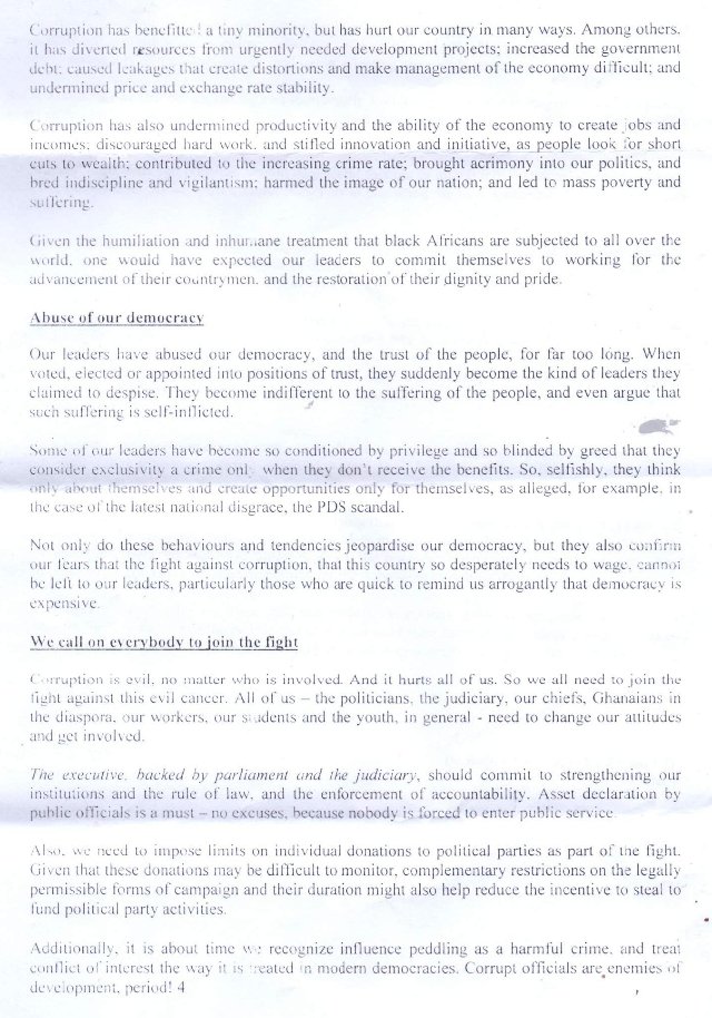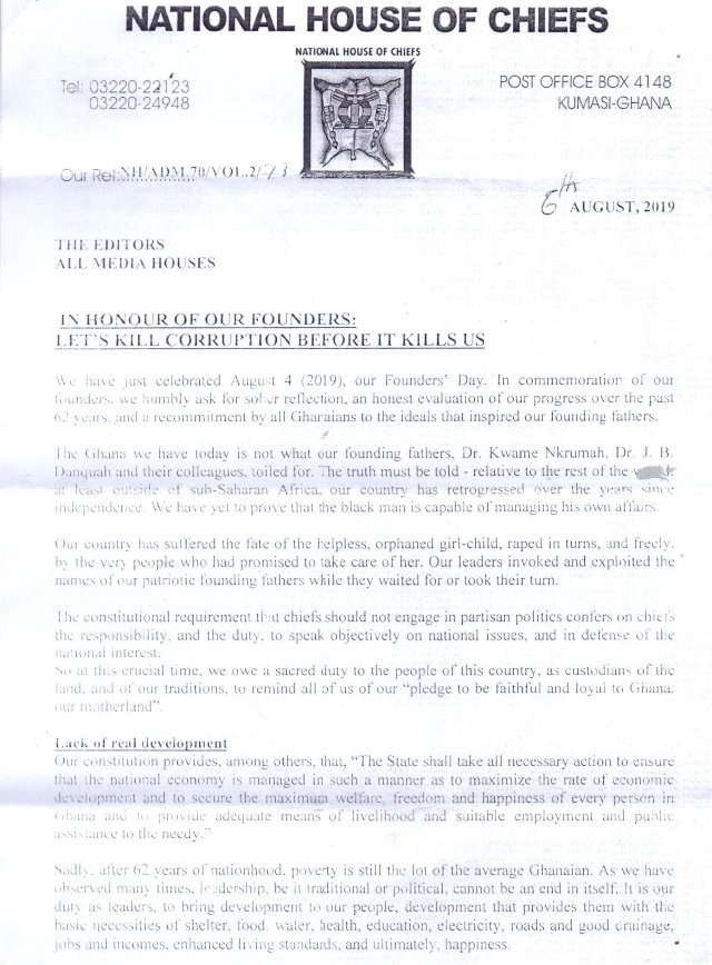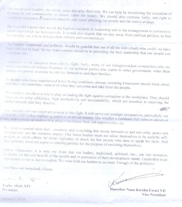 The four-page statement titled, ‘’In honour of our founders: Let’s kill corruption before it kills us,’’ is jointly signed by President, Togbe Afede XVI, and Vice-President, Daasebre Kwebu Ewusi VII.