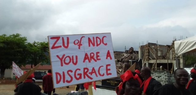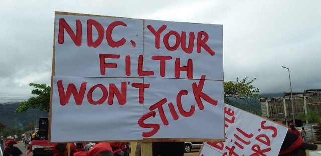 Demonstrators hold placards showing their disapproval of the comment by the NDC executive.