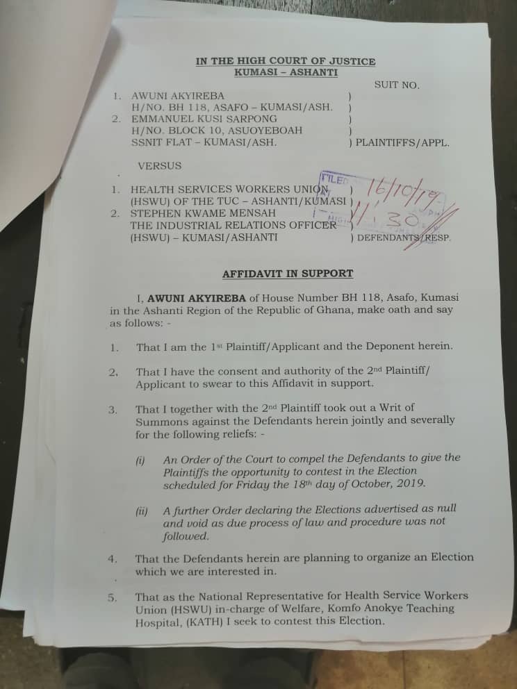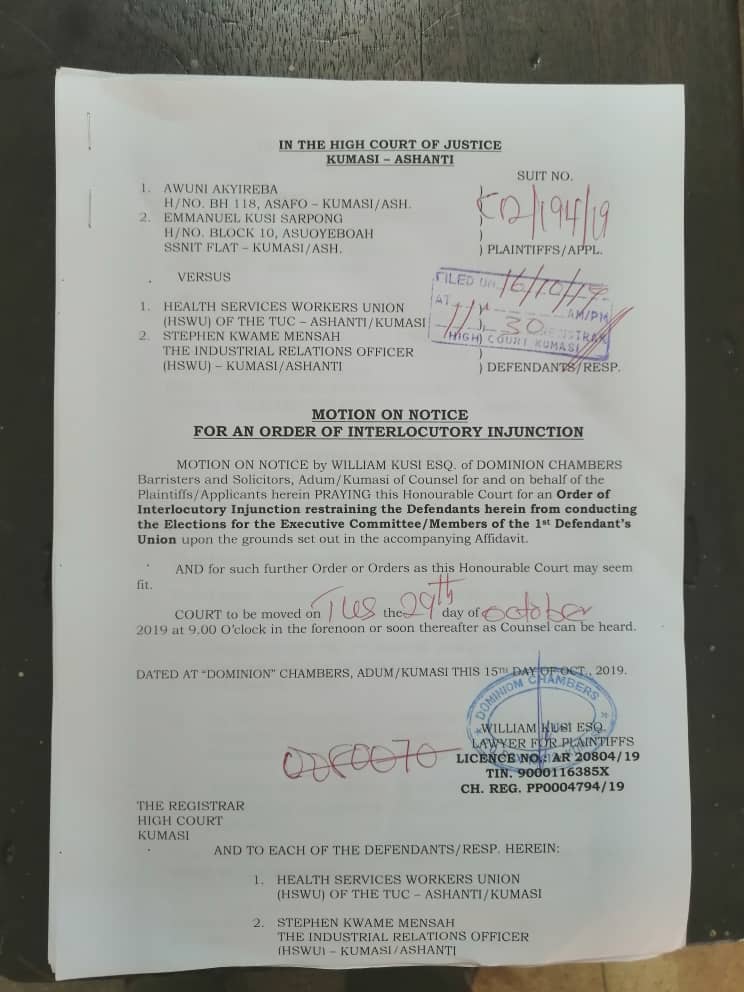 The two aggrieved Komfo Anokye Teaching Hospital (KATH) Health Service Workers Union (HSWU) members on Wednesday October 16, 2019 secured court order restraining leadership from conducting elections to elect new crop of leaders to steer affairs of the Union for another four year term.