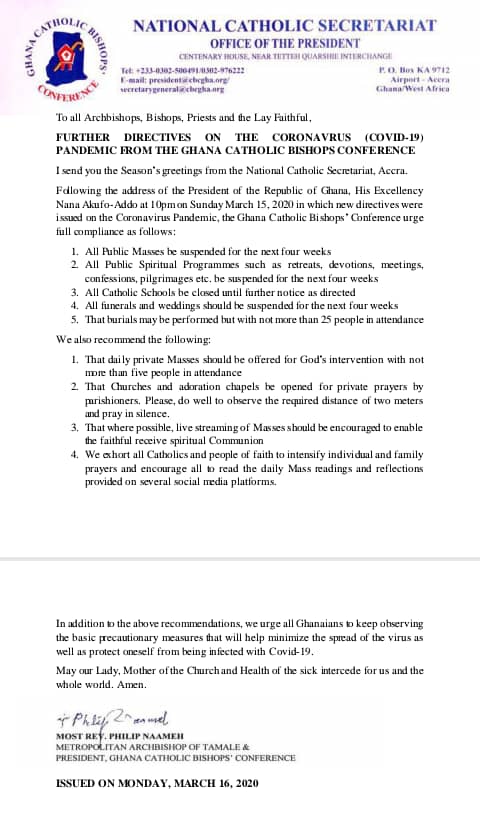 The Ghana Catholic Bishop Conference (GCBC) has called for full compliance of President Akufo-Addo’s directives on the ban of public gathering following six reported cases of coronavirus.