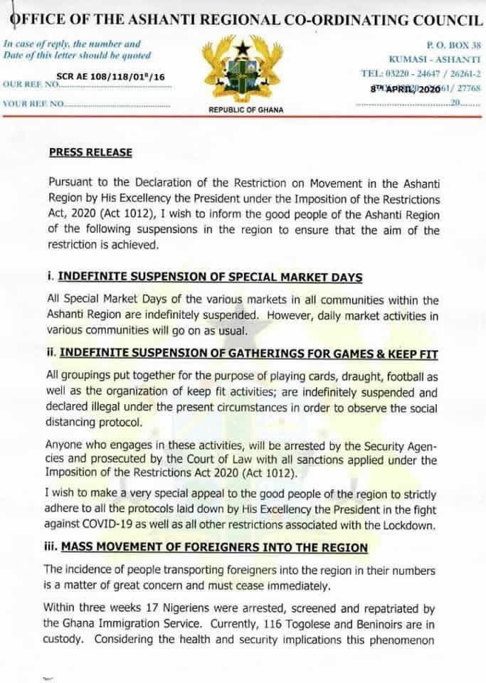 After the Ashanti Region has been noted as the second highest coronavirus prone area in the country, the Regional Minister, Simon Osei-Mensah declared a ban on the mass movement of foreigners into the region in a bid to contain the disease which is fast spreading.