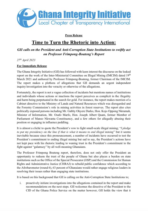 The Ghana Integrity Initiative (GII) is calling on institutions such as the Office of the Special Prosecutor (OSP) and the Commission for Human Rights and Administrative Justice (CHRAJ) to rebuild public confidence by probing the galamsey report authored by Professor Kwabena Frimpong-Boateng.