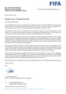 A letter signed by FIFA official Veron Mosengo-Omba and addressed to the GFA dated Tuesday, June 26, disclosed that other members of the delegation for the meeting slated for Zurich, Switzerland on June 28 are the Minister of Youth and Sports, Isaac Kwame Asiamah as well as Mr Kweku Eyiah and Mr Alex Asante who will represent the Ghana Football Association.