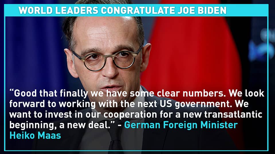 German Chancellor Angela Merkel said she looked forward to “future cooperation” with Joe Biden.