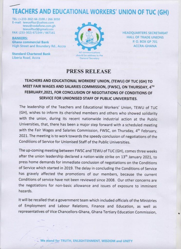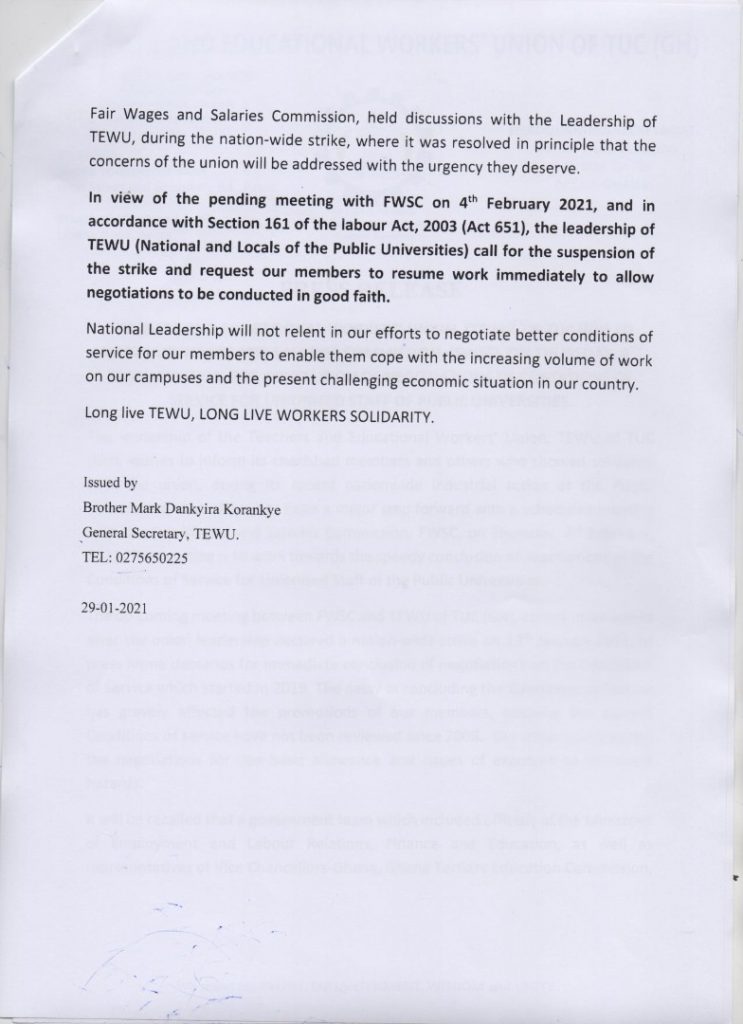 “In view of the pending meeting with FSWC on 4th February 2021, and in accordance with Section 161 of the labour Act 2003 (Act 651), the leadership of TEWU (National and Locals of the Public Universities) call for the suspension of the strike and request our members to resume work immediately to allow negotiations to be conducted in good faith”, the statement said.