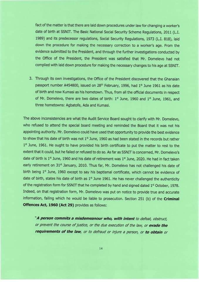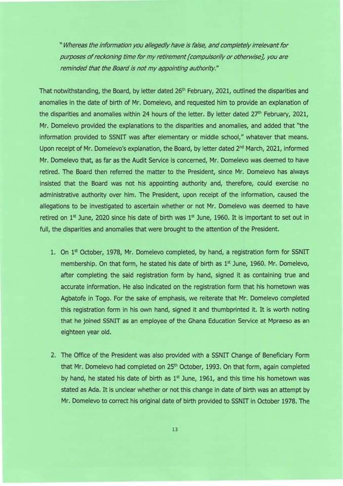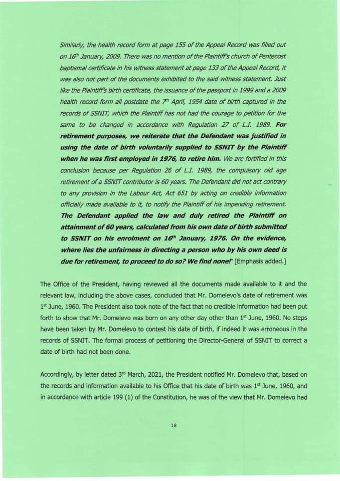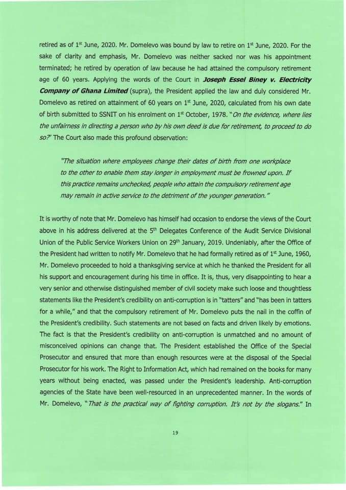 The directive, according to a statement signed by Secretary to the President, Nana Asante Bediatuo, was because Mr Domelevo has exceeded the eligible age to remain in the workforce.