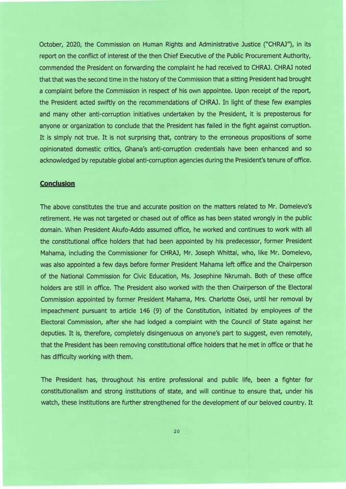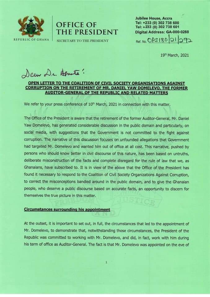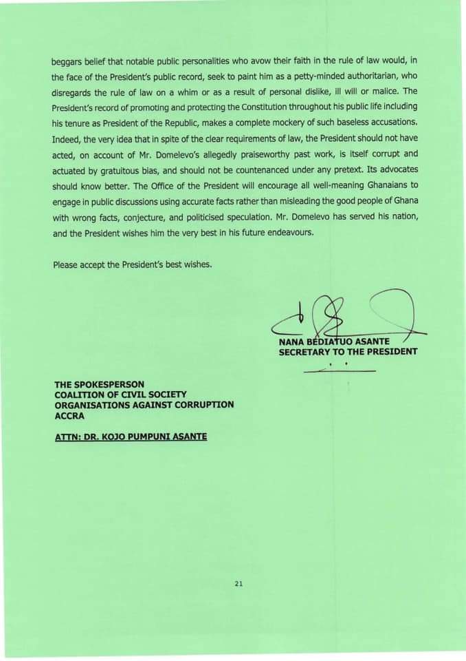 Outlining the events that led to Mr Domelevo’s appointment and retirement, the president, in a 21-page letter to the Coalition of Civil Society Organisations Against Corruption on Friday, 19 March 2021, noted that “…The former President had consulted the Council of State on appointing Dr Felix Kwame Aveh as Auditor-General. It is also clear that the consultation process was done before the December 7, 2016, elections”.