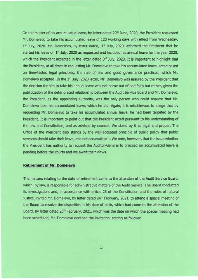 On March 3, 2021, President Akufo-Addo directed the Auditor-General, Daniel Domelevo to proceed on retirement after he returned from a 167-day accumulated leave.