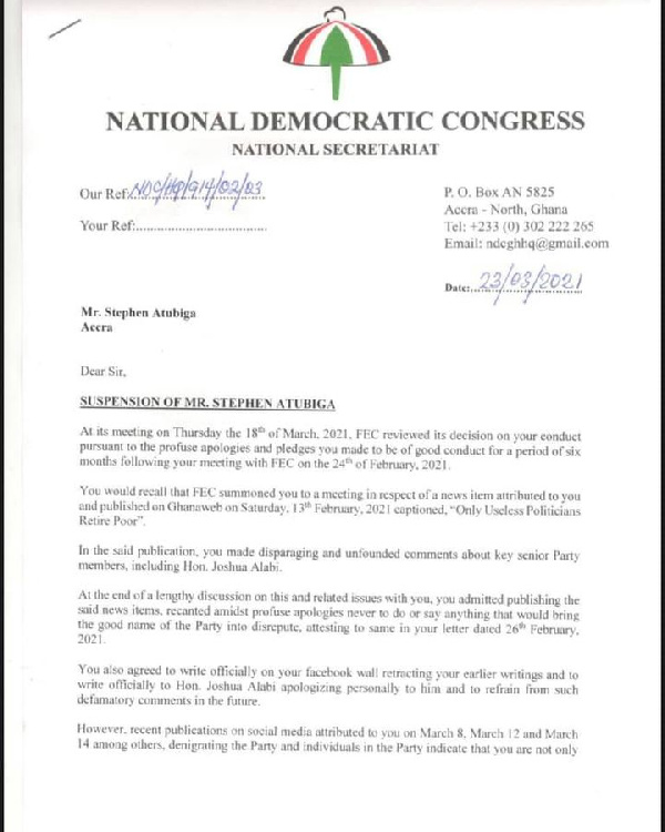The NDC in a statement noted that during its Functional Executive Committee (FEC) meeting after summoning Mr Atubiga in February in respect of a news item attributed to him captioned “Only useless politicians retire poor” where he made disparaging and unfounded comments about key senior party members including Joshua Alabi, he was told to apologise and retract his statement.