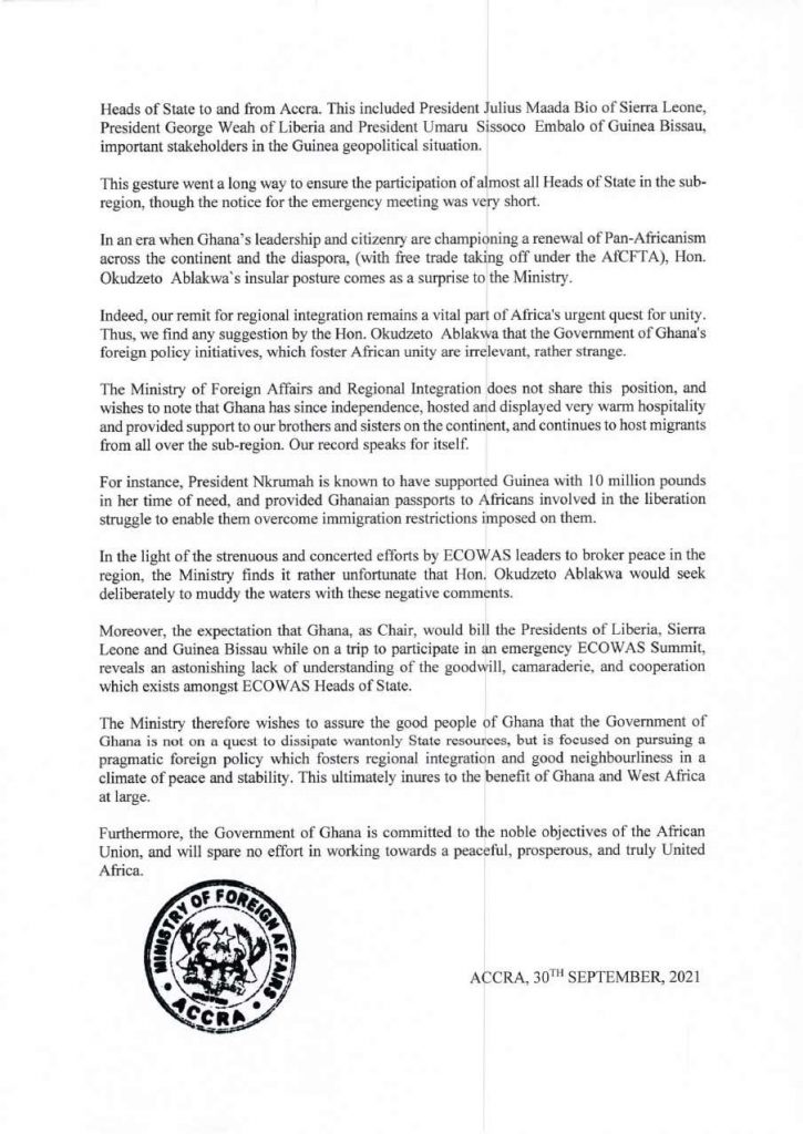 “In the light of the strenuous and concerted efforts by ECOWAS leaders to broker peace in the region, the Ministry finds it rather unfortunate that Hon. Okudzeto Ablakwa would seek to deliberately muddy the waters with these negative comments,” the statement said.