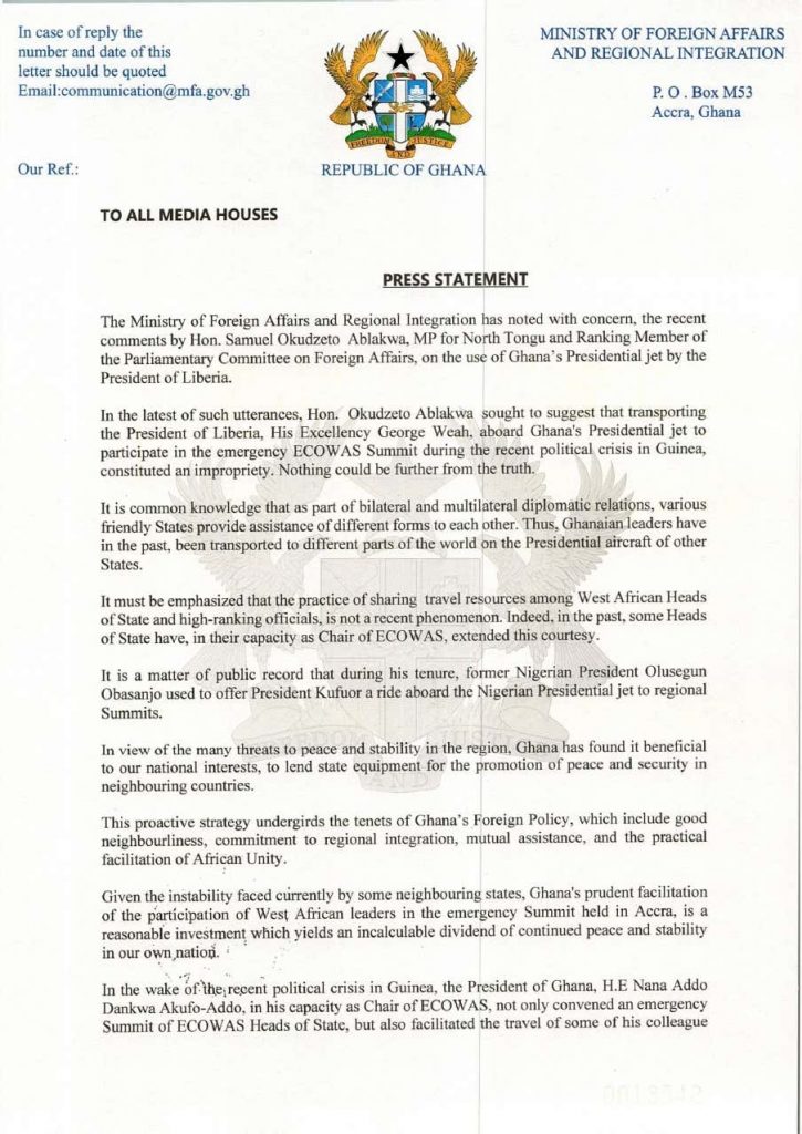 In a statement dated 30 September 2021, the ministry said it has noted with concern reservations raised by the National Democratic Congress (NDC) MP for North Tongu, Samuel Okudzeto Ablakwa, over the use of Ghana’s presidential jet by Liberian leader George Weah to the recent ECOWAS summit in Accra.