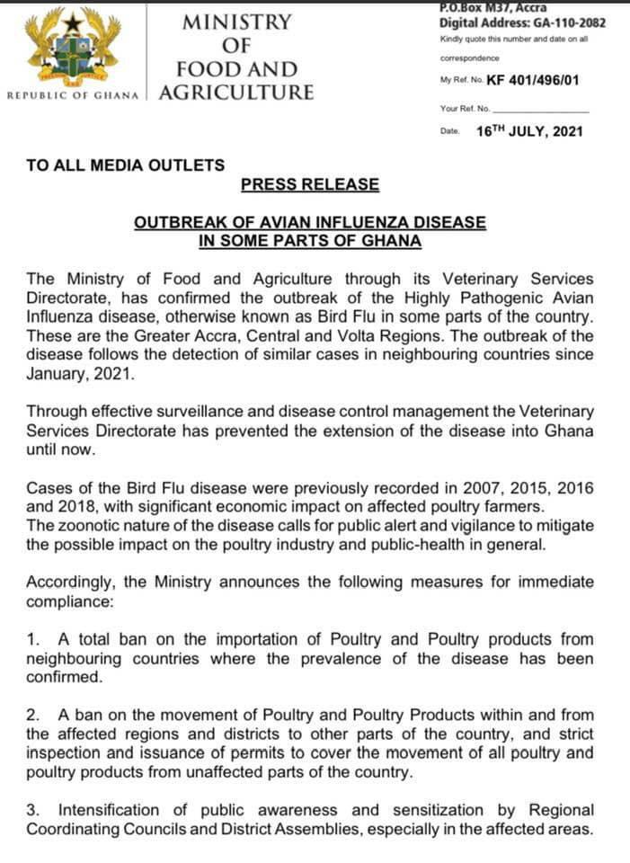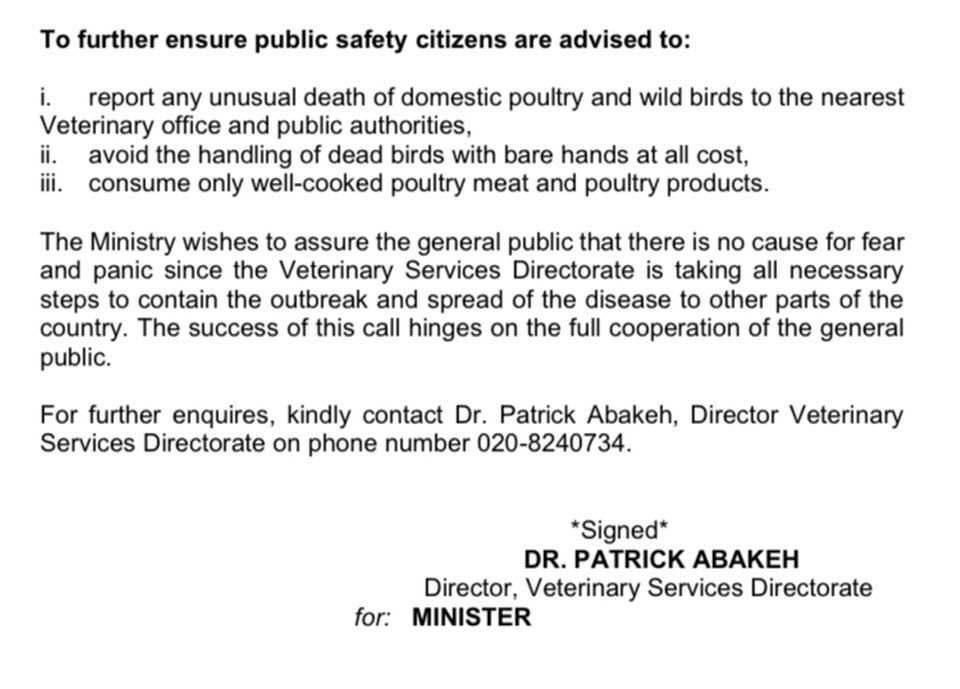 The Food and Agriculture Ministry through its Veterinary Services Directorate has confirmed the outbreak of the Highly Pathogenic Avian Influenza disease, otherwise known as Bird flu in some parts of the country.