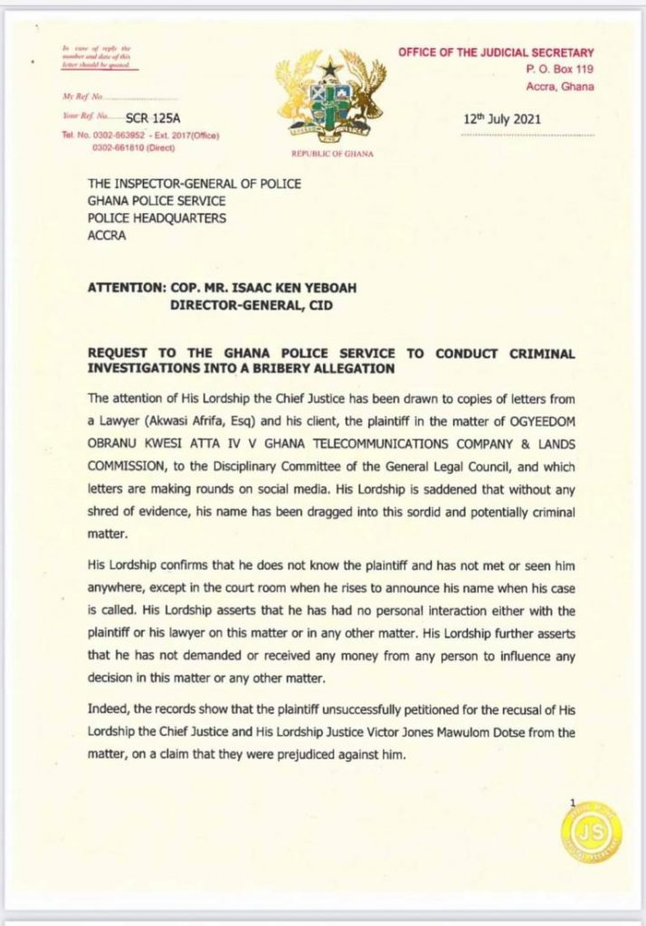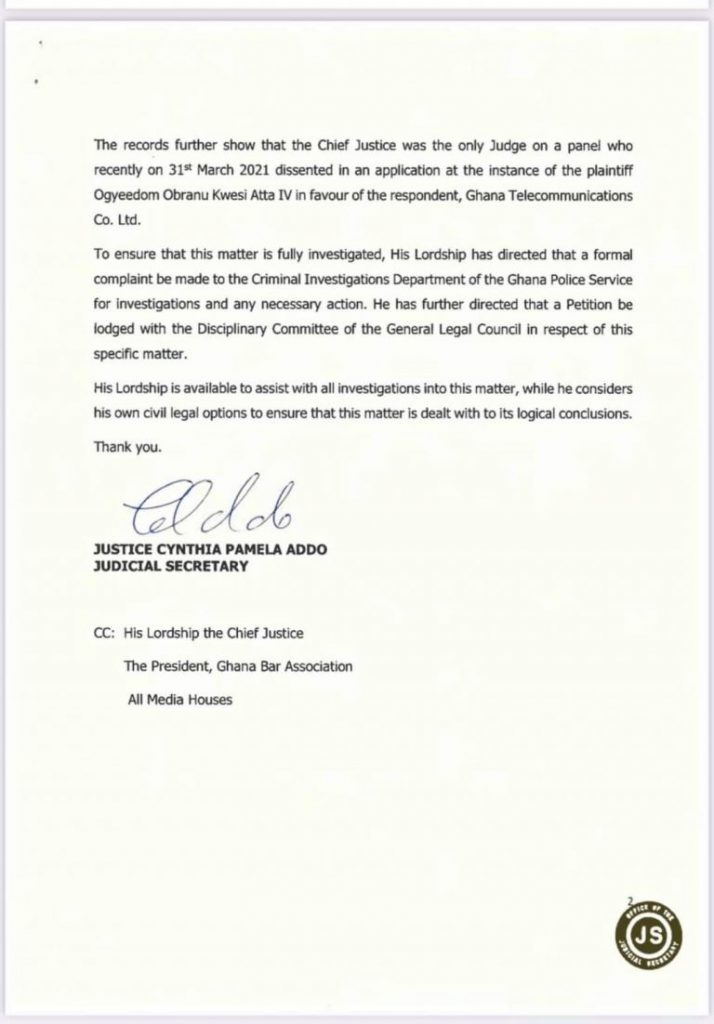 “His Lordship has directed that a formal complaint be made to the Criminal Investigations Department of the Ghana Police Service for investigations and the necessary action,” the petition signed by the Judicial Secretary, Justice Cynthia Pamela Addo said.