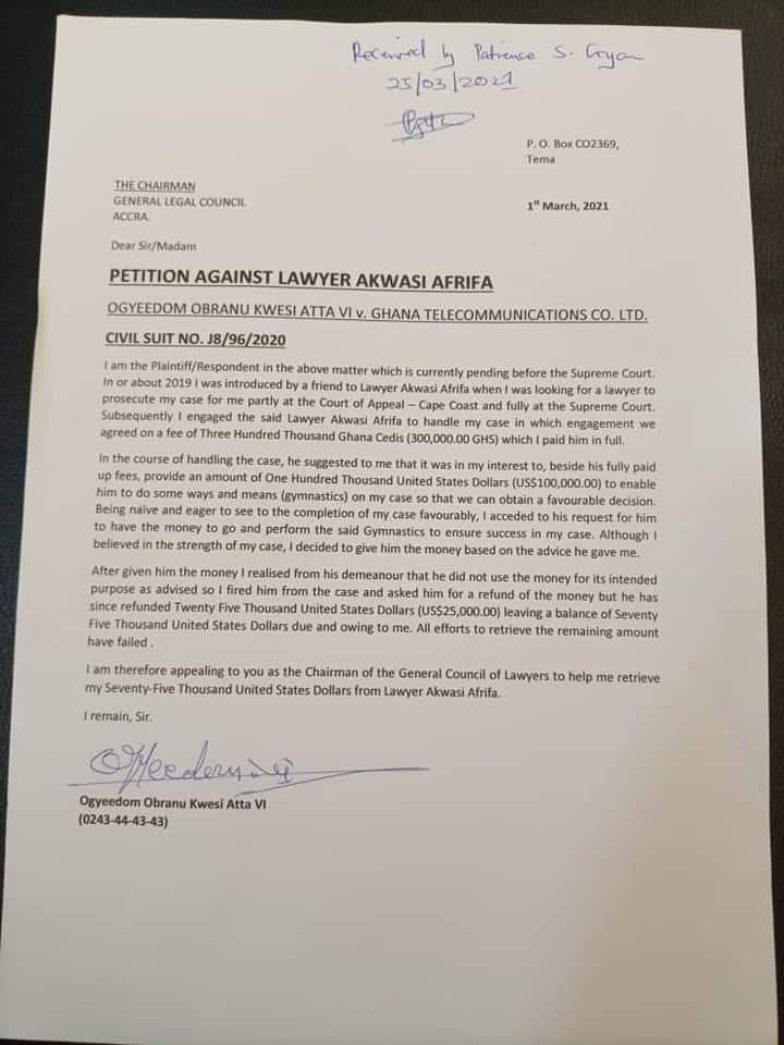 The client – Ogyeedom Obranu Kwesi Atta VI dragged Akwasi Afrifa to the GLC for allegedly taking US$100,000 from him but failing to ensure he gets a favourable judgement on his case as promised.