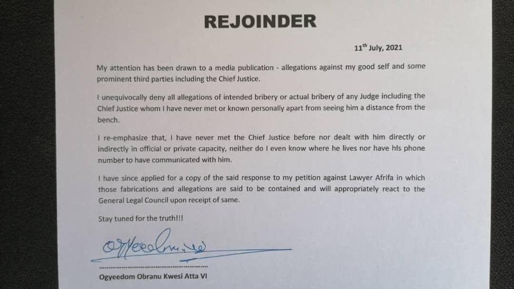 Akwasi Afrifa in his response denied these claims, saying his client rather asked him to refund an amount of GH¢300,000 paid as legal fees to enable him to raise a US$5 million bribe for the Chief Justice in order to get a favourable decision in a pending legal dispute – an allegation the latter has denied.
