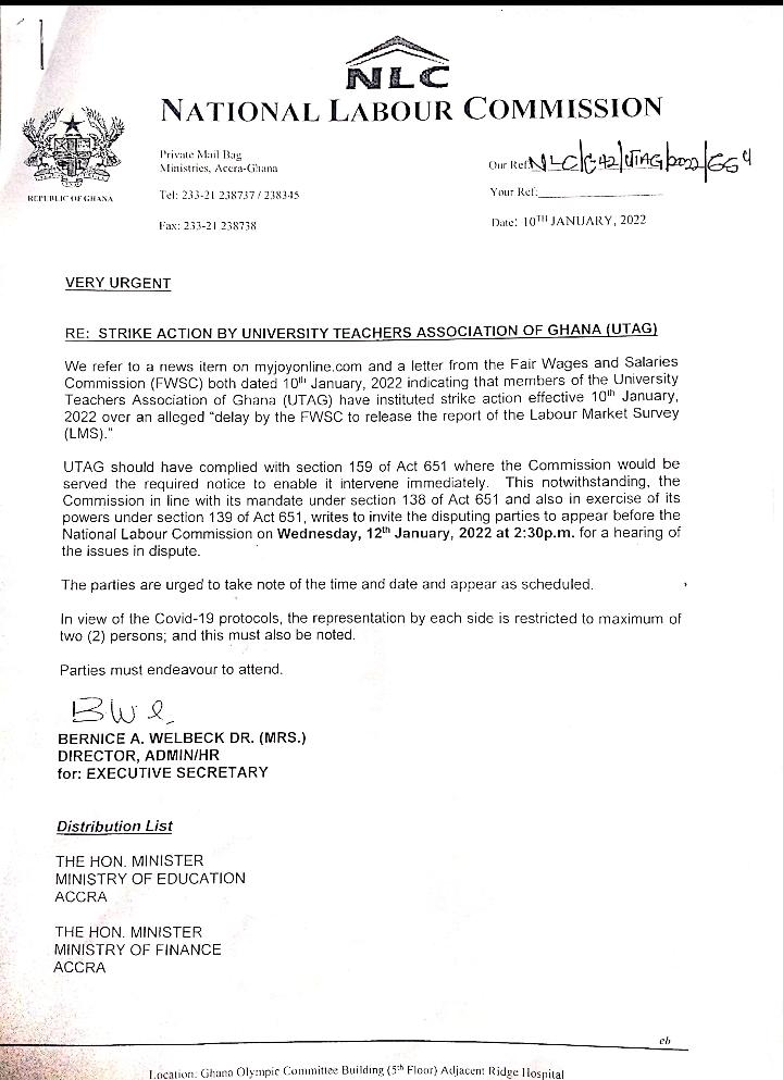The National Labour Commission (NLC) has invited the University Teachers Association of Ghana (UTAG) and the Fair Wages and Salaries Commission (FWSC) for a meeting over the former’s ongoing strike.