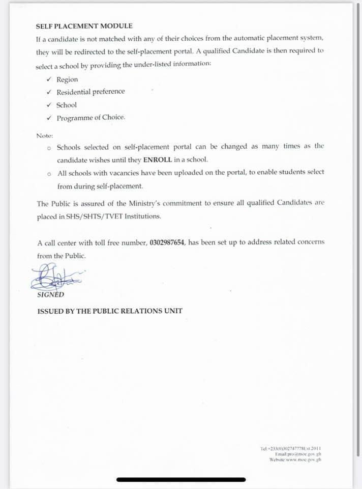 The public is assured of the Ministry’s commitment to ensure all qualified candidates are placed in SHS/SHTS/TVET institutions.