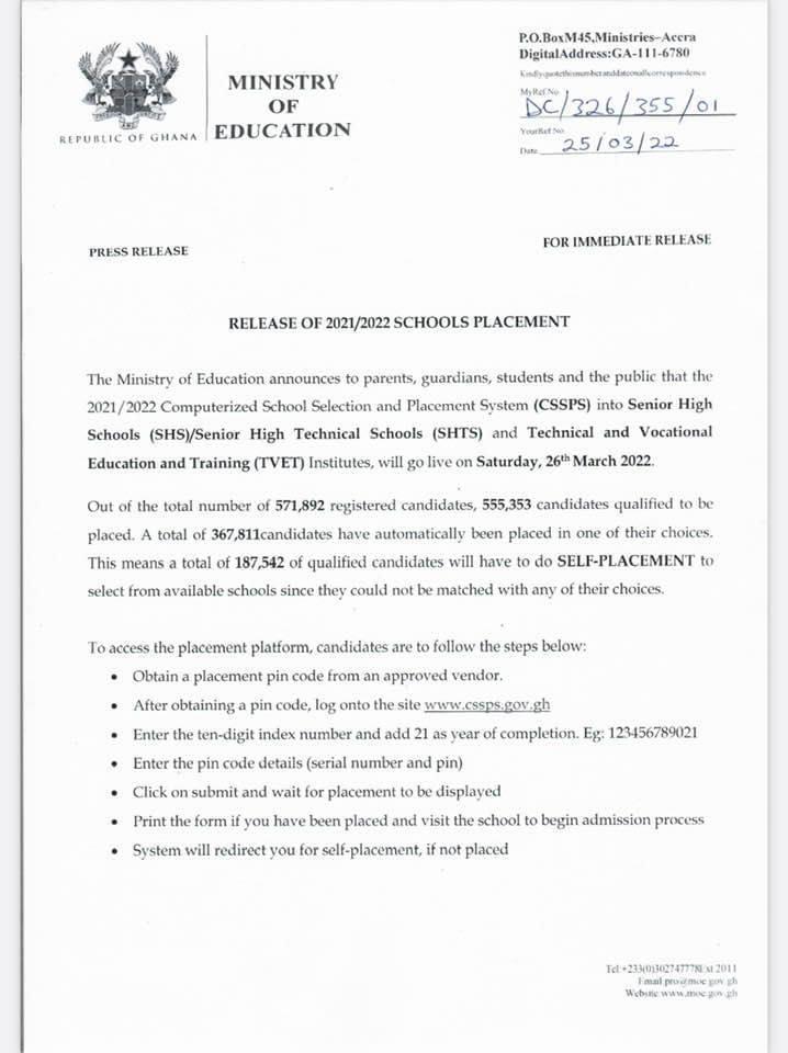 “The 2021/2022 Computerized School Selection and Placement System (CSSPS) into Senior High Schools (SHS)/ Senior High Technical Schools (SHTS) and Technical and Vocational Education and Training (TVET) Institutes, will go live on Saturday, March 26, 2022,” a statement from the Ministry and sighted by OTECNews noted.