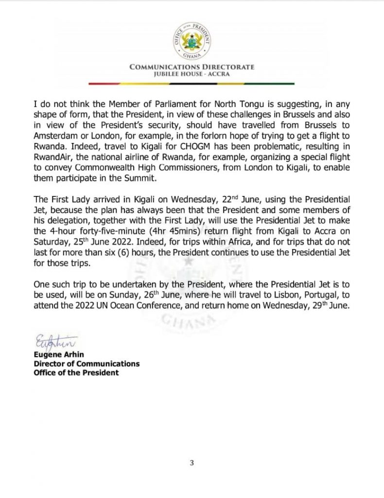The Director of Communications at the Office of the President, Eugene Arhin, has debunked the claims made by the NDC Member of Parliament for North Tongu, Samuel Okudzeto Ablakwa, that His Excellency Nana Addo Dankwa Akufo-Addo travelled to Belgium for the 15th Edition of the European Development Days Forum in Brussels with a private jet.