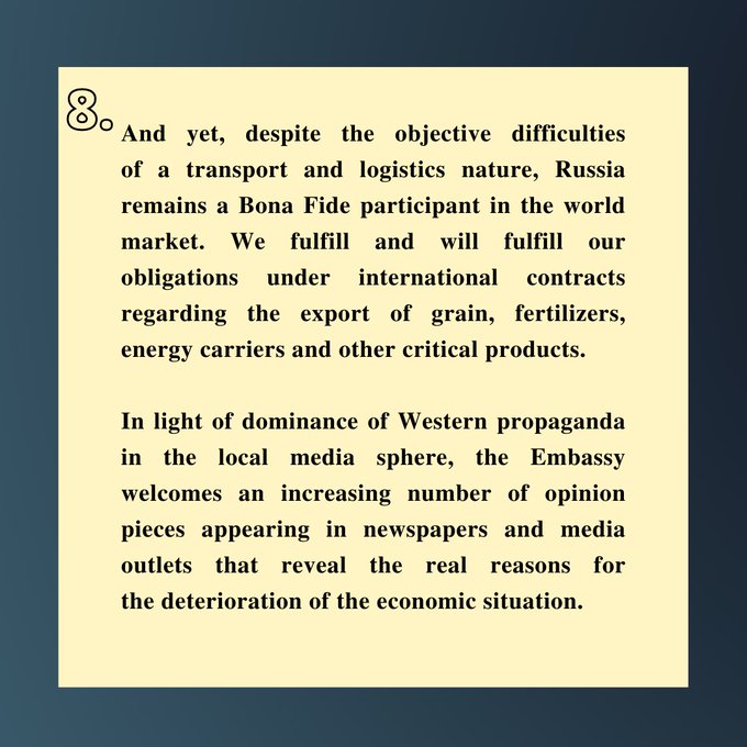 In a tweet Thursday, the embassy accused the media of deliberately ignoring the fact that policies of the West had triggered economic challenges on the continent since 2020.