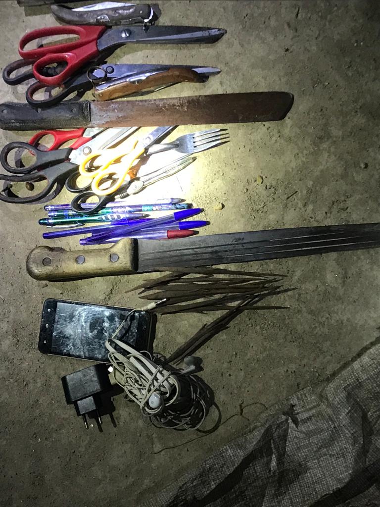 Further checks conducted in his room found sets of scissors, machetes, pens, jack knife and other deadly weapons.