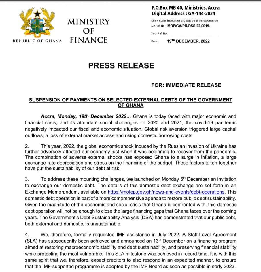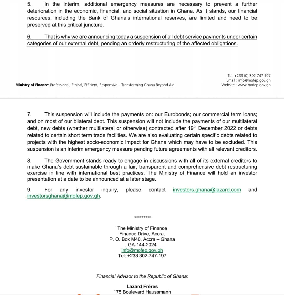 This suspension, according to a statement issued by the Finance Ministry, will not include the payments of Ghana’s multilateral debt, new debts (whether multilateral or otherwise) contracted after 19th December 2022 or debts related to certain short term trade facilities.