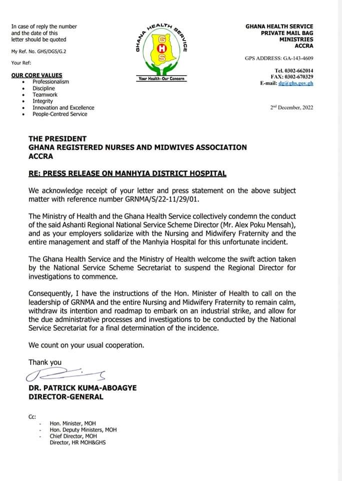 Nurses and midwives at the Manhyia District Hospital in Kumasi have returned to work after they were directed to call off their strike.