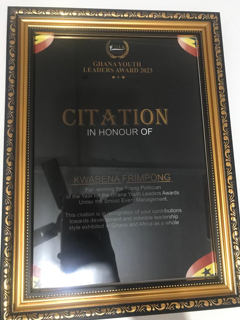 The Deputy Protocol Director at the National Headquarters of the Governing New Patriotic Party (NPP), Mr Kwabena Frimpong has been honored as Young Politician of the Year by Smivic Communications Limited, the organizers of the Ghana Youth Leaders Awards (GYLA).