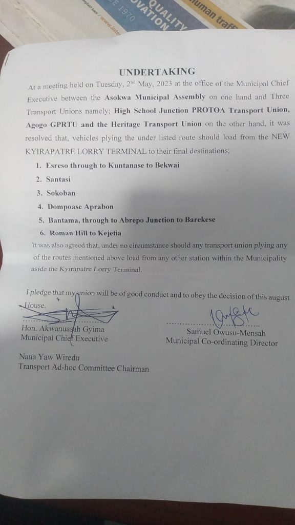 They also agreed that, under no circumstance should any Transport union plying any if the routes mentioned above load from any other station within the Municipality aside the Kyirapatre Lorry Terminal.