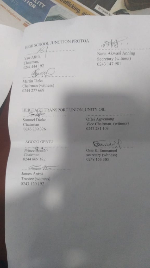 Similarly, the Asokwa MCE, Chief Akwannuasah Gyimah as well as the Coordinating Director, Mr Samuel Owusu-Mensah and Nana Yaw Wiredu, Transport Adhoc Committee Chairman signed on behalf of the Asokwa Municipal Assembly.