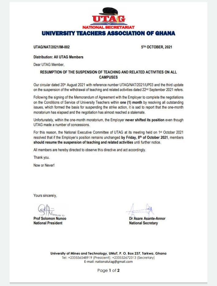 The University Teachers Association of Ghana (UTAG) has served notice it will resume “suspension of teaching and related activities” by Friday 8 October 2021 if the government fails to shift its position in finding solutions to their conditions of service.