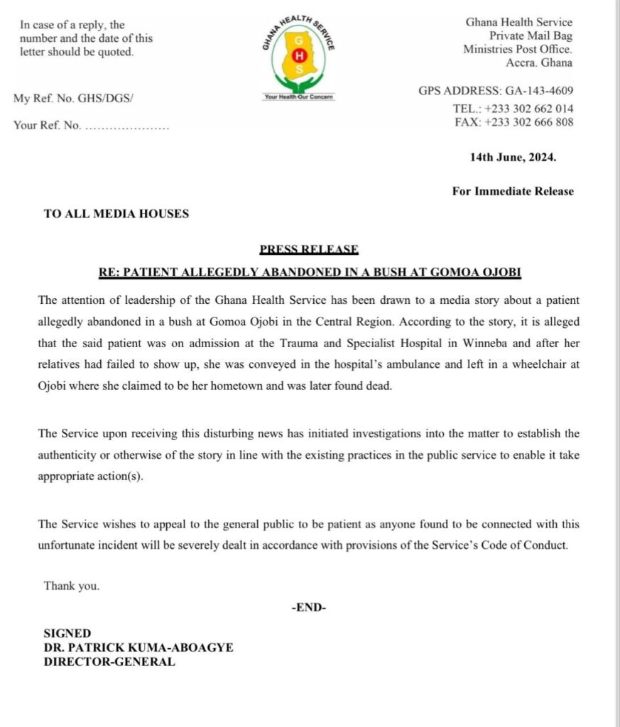 The attention of leadership of the Ghana Health Service has been drawn to a media story about a patient allegedly abandoned in a bush at Gomoa Ojobi in the Central Region. According to the story, it is alleged that the said patient was on admission at the Trauma and Specialist Hospital in Winneba and after her relatives had failed to show up, she was conveyed in the hospital’s ambulance and left in a wheelchair at Ojobi where she claimed to be her hometown, and was later found dead.